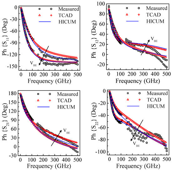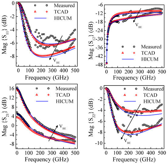 Prior to concluding this work, here we present for the first time a comparison among the results obtained from the measurements, TCAD simulation and SPICE simulation of the HICUM model equivalent circuit with the extracted RF parameters up to 500 GHz (see Figure 18 and Figure 19). Previously reported results were obtained up to 325 GHz but were limited in terms of data ( S 21 , H 21 , M A G ( U ) ) [27] or only in one frequency band [28]. Considering the TCAD simulation as a reference, HICUM shows a high level of model agreement in the amplitude and phase of all s-parameters for two different bias points near the peak f T .