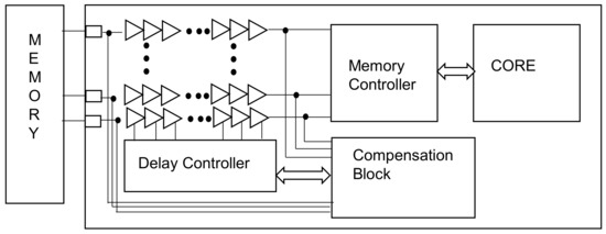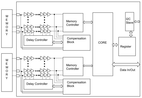 The proposed method consists of the blocks shown in Figure 2. First, a delay cell is connected to an external memory through the general purpose input output (GPIO). Each delay cell is connected to a delay control block to adjust the amount of delay. The output of the delay is connected to the memory controller, whose role is to deliver addresses, reads, and writes in a timely manner with respect to memory operations. There is a compensation block under the memory controller that not only adjusts skew between pins connected to the memory, but also corrects data to be reliably exchanged from the external environment at the beginning of the system. The core, which is a processor of AI, uses the necessary data by passing instructions to the memory controller to read and write the data from external memory.