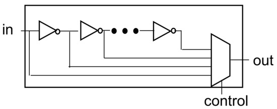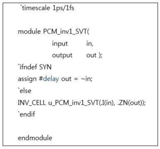Figure 3 shows a block diagram of one delay chain. The inverter is connected, and the output of each inverter is connected to the multiplexer so that the desired delay output can be selected by the control pin. To design an RTL using a delay cell, a model must be created by calculating the delay corresponding to the inverter cell provided by the process. Figure 4 shows the simulation logic code for the inverter logic.