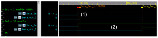 The inverter cell among the primitive cells provided by the process is selected, and the delay value of the inverter cell is calculated and put it in the # delay to see the change in the delay in the RTL simulation and to check the overall operation. Figure 5 shows the simulation results, indicating that the delay increases as the delay step is increased using the simulation model. In Figure 5, each step can increase the delay with the delay set in #delay in Figure 4: (1) is the result when the delay is made into one step and it pushes about 200 ps, while (2) shows that 6600 ps is pushed because of running the simulation by pushing 33 steps. Among the primitive cells provided by the process, it is possible to use the primitive cells suitable for the desired amount of delay for the testing.