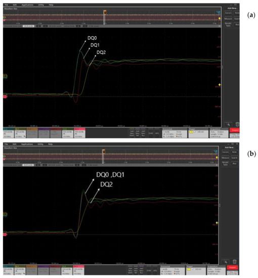 Figure 11 is the result of measuring the data pin using an oscilloscope. A total of three data points were measured at the same time, and a phase difference was deliberately made using a delay controller for the measurement. Looking at Figure 11a, we can see that the skews of DQ0, DQ1, and DQ2 are different. Figure 11b shows the result of adjusting the skew by adjusting the delay controller corresponding to DQ1 through I2C.