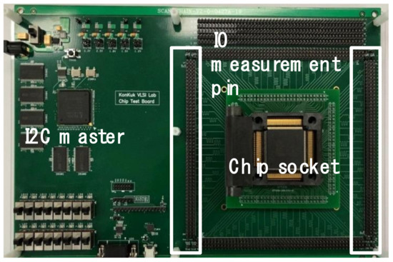 Figure 12 is the environment for measuring the chip. The chip used a socket to enable change, and the FPGA was used to set the environment of the I2C master and measurement board. For measurement, all of the IO of the chip was pulled out with pins.