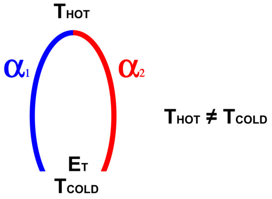 The thermocouple is a simple device based on the Seebeck phenomenon. It consists of two different conductive or semiconductive materials connected by opposite ends, e.g., as shown in Figure 2. An electromotive force will appear between the junctions when they are held at different temperatures and an electric current will flow in the system [3]. The value of the resulting electromotive force is directly proportional to the temperature difference between the junctions and to the parameters characterizing thermoelectric materials, Seebeck coefficients (Equation (1)).