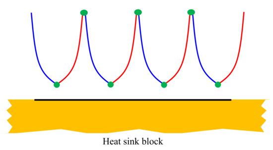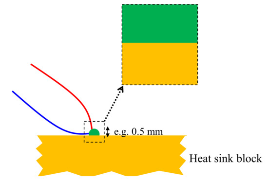 The problem with the poor thermal contact can be partially solved by making a weld directly on the heat sink surface. A permanent connection between the thermocouple legs and the copper block is created. It improves the thermal contact. However, the volume of the thermoelectric junction still is too large (Figure 5). Moreover, the problem of a small output signal remains unsolved. This can be solved by using a thermopile. An exemplary solution is presented in Figure 6. However, a new problem with electrical contact appears. A short circuit occurs if the welds are in direct contact with the conductive copper block and it is impossible to read the output signal. Therefore, the thermocouple junctions have to be electrically separated from the copper surface. This can be achieved, e.g., by passivating the copper surface or by placing a thin insulating material on it (in Figure 6 the insulating layer is marked black). However, it is not possible to make a weld integrated with the copper surface, as shown in Figure 5. Consequently, the problem of large volume of the thermoelectric junction is renewed. All indicated problems and phenomena concern both ends of thermocouples and both types of thermoelectric junctions (“hot” and “cold” ones) placed on both copper blocks (CPU_heat_sink and FAN_heat_sink) visible in Figure 1 and Figure 3a.