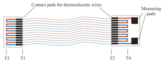 The red and blue paths on both substrates as well as the contact pads (black) are made using the same material, PdAg-based ink. In fact, they are only electrical connectors, not thermocouple legs. The screen-printed paths have only a connecting function and according to the thermoelectric Law of Intermediate Materials do not affect the generated thermoelectric force. This law says that if the third (and subsequent) material is included in the thermoelectric circuit, it does not make any modifications to the measuring signal provided that both its ends are placed at the same temperature [3]. This is maintained for the considered device. The disadvantage of the solution is that the thermocouples monitor the temperature at the point of soldering the wires to the paths (in the area of contact pads). In other words, the temperature at the point of contact between thermoelectric wires and contact pads is monitored (points marked T1 and T2 in Figure 8). This is important because the cross-section of thermoelectric wires is much larger than the cross-section of screen-printed paths. Thus, they can draw the heat from the measuring points and reduce the measured temperature difference. It can be argued that the temperature difference T1 − T2 will be less than T3 − T4. Verification of this thesis will be presented in the paper later. The advantage of this solution is a simple construction. By transferring the thermoelectric junction from the weld (whose shape is poorly matched to the surface of the heat sink, Figure 4) to the flat ceramic substrate, good thermal contact is obtained. Nickel and silver thermoelectric wires were used for this version of sensor. Thus, the Ag/Ni thermocouple was formed. Contact pads in all sensor versions were made of well solderable PdAg ink (which, according to the Law of Intermediate Materials, did not affect the measurement results), which made it easier to solder of thermoelectric wires.