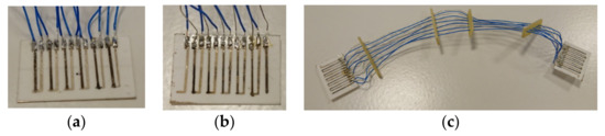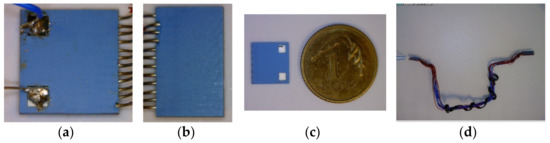 The solder material and the thermocouple wires were placed in the mounting holes in the next step. Then the whole structure was heated up to 300 °C. This temperature is not harmful for LTCC ceramics, but it melts the solder. The contact pads and thermoelectric wires are wetted. After cooling down, the final sensor structures were obtained. Figure 13 shows the final structures for FAN_heat_sink (a,c) and CPU_heat_sink (b) with mounted thermoelectric wires. The whole sensor is presented in Figure 13d where both LTCC structures, thermoelectric wires as well as two measurement wires are visible. The basic electrical and thermoelectric parameters of the fabricated sensors were measured—internal electrical resistance as well as Seebeck coefficient. The automatic measuring system was used [15,17,20]. Table 1 presents the basic information about the sensors.