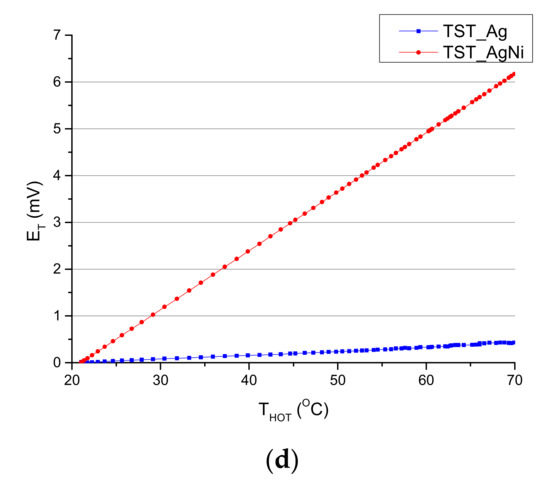 An experiment was performed to verify above. Two sensors were fabricated according to Figure 8. Thermoelectric legs of Ag (red) and Ni (blue) inks were screen-printed on the substrates. They formed 6 Ag/Ni thermocouples. The Seebeck coefficient of each thermocouple was 21 µV/K, the thermoelectric force generated by each structure was 6 × 21 = 126 µV/K. The sensors differed in the thermoelectric wires used. In the first one (TST_Ag) only silver wires were used (Figure 9a). In the second one (TST_AgNi), silver and nickel wires were used (Figure 9b), red and blue in Figure 8, respectively. “Hot” sides (substrates) of the sensors were placed on a regulated heater, “cold” on a heat sink. “Hot” ones were heated from room temperature to 70 °C, while the temperature of the cold ones was stabilized (~21 °C). The output voltage of the structures was measured every 1 s. Figure 9 shows the structures and the obtained results.