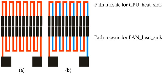 Sensors were made by screen-printing of conductive inks on LTCC tapes. Every version of the sensor consists of two LTCC substrates (with printed paths) and thermoelectric wires. The LTCC substrates have direct contact with the copper blocks of the active heat sink, in the paper marked as CPU_heat_sink and FAN_heat_sink (Figure 3a and Figure 7b). This topology gives very good surface contact between the sensor and the active heat sink. Moreover, the measurement points (thermoelectric junctions) were distanced from the wires. Thanks to this, the negative influence of heat transport through the wires volume on the results was reduced.