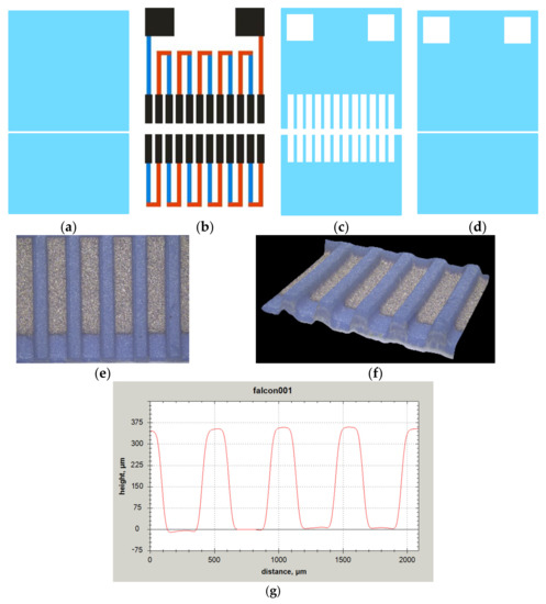 Figure 11e,f show pictures of the area of contact pads after assembling the 4 lower tapes (without cover tape). The photos were taken using the Leica DM 2700M (Leica Camera AG, Wetzlar, Germany) optical microscope. Figure 11g shows the profile of the structure cross-section.