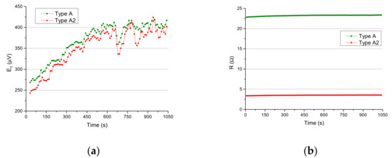 The comparative study between sensors A and A2—different material for screen-printed legs: (a) output voltage responses vs. time; (b) internal resistance vs. time.