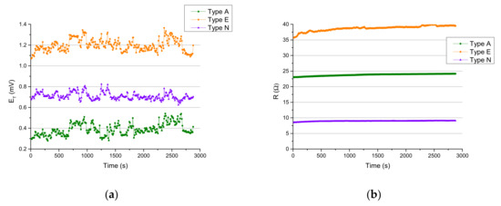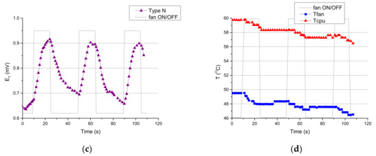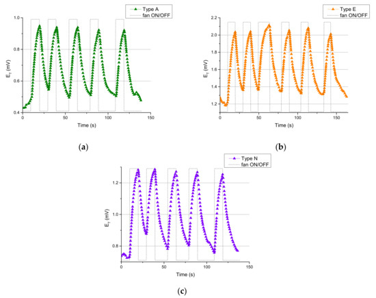 The maximum level of the voltage response of the sensor A was about 1.1 mV, E—1.7 mV, N—0.9 mV. The thermal conditions were equal for each sensor. The sensor version E generates the highest output signal, because it is fabricated using the most thermoelectrically efficient materials (CuNi/NiCr, E-type thermocouple). However, more important parameter is the range over which the output signal changes (ΔU = ETmax − ETmin). The range ΔU can be extracted from Figure 18 as 0.20–0.25 mV for sensor N, 0.45 mV for sensor E and 0.75 mV for sensor A. Sensor version A seems to have the highest sensitivity to thermal condition changes. It should be noted that the responses of sensors A and N differ from each other despite the fact that they were fabricated using the same thermoelectric wires.