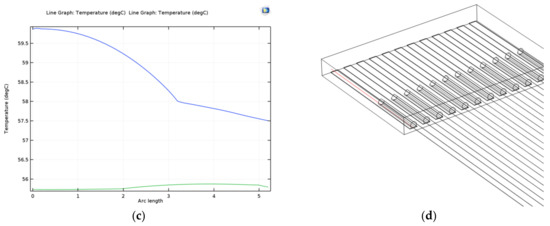 Simulation results of temperature distribution along thermoelectric legs: (a) general view of the sensor; (b) cross-section of the thermoelectric legs; (c) temperature distribution along screen-printed legs inside of left (blue) and right (green) LTCC substrates; (d) visualization of the line for blue graph.
