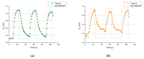 Characteristics presented in Figure 19 show that the sensors responses are practically immediate. When the fan is turned on as well as it is turned off, the signal starts to change immediately. However, analysis of the subsequent measurement points revealed some differences between the sensors. The sensors increase the level of the generated signal in the first interval—i.e., the first measurement after switching the fan on/off shows a difference in the signal level. This is a slight difference, but it can be detected by the sensors used. For sensor N the change of the signal level by 1% occurs after approximately 0.2–0.4 s (first or second measurement cycle) after switching on/off the fan. On the other hand, the sensor E changes the signal level by 1% after 0.4–0.6 s when switching on and 0.4 s when switching off the fan whereas sensor A—0.4 s after switching on/off the fan.