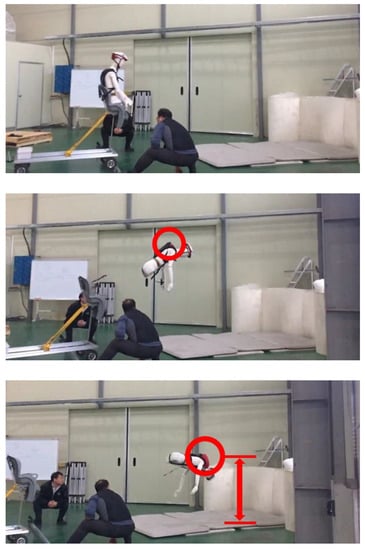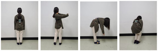 In daily life, people take various positions such as leaning, twisting, and tilting their bodies. To prevent malfunctions in these cases, data on stretching and light movements such as those shown in Figure 5 were additionally obtained. The daily movement data were used as “no accident” data as opposed to accident data when learning [1,2,3].