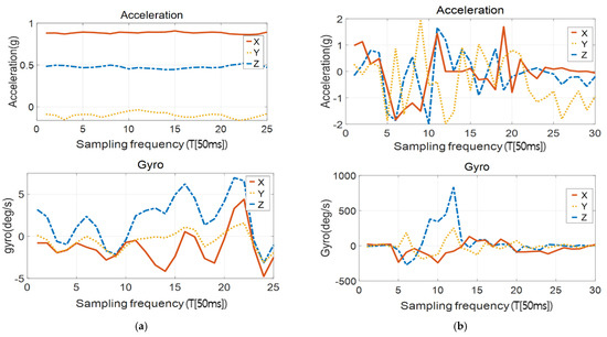 The graphical representation of data obtained from an accident experiment is shown in Figure 6. Figure 6a shows graphs when driving safely; Figure 6b shows graphs when accidents occur. In Figure 6a, the acceleration or angular velocity axis proceeds without significant fluctuation, but in Figure 6b, the acceleration and angular velocity axes fluctuate greatly.