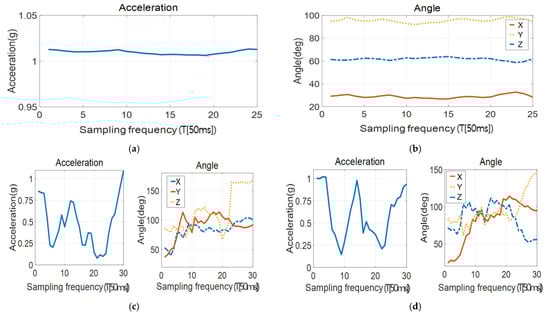 Corrected acceleration and angle graphs for the cases of no accident and accident: (a) no accident—acceleration; (b) no accident—angle; (c) accident—1; (d) accident—2.