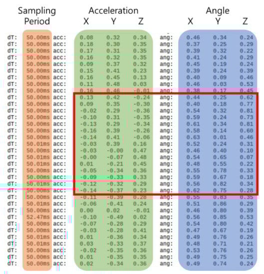 Figure 8 is a screenshot of how the filtered input data appear when the AI model receives input from the Raspberry Pi in real time. From the left, the values respectively mean the sampling time, acceleration, and angle. As there are three axes of acceleration and angle, the values for acceleration and angle are arranged by three each in the order of XYZ.