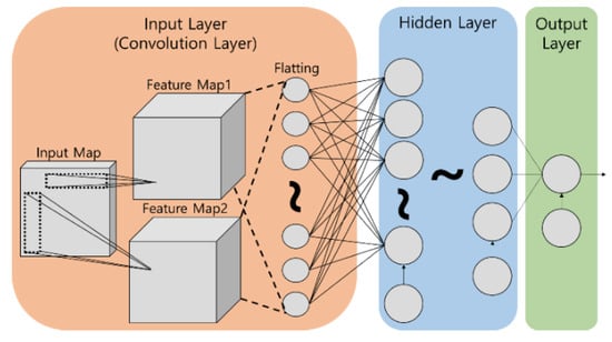 The O-CNN used two convolution layers for the input layer. Both convolution layers were used only as a single layer at the input layer position. The O-CNN’s convolution layers used four filters each. Each filter on the convolution layer has the form of 1 × 15 and 6 × 1 matrix, which is the same as the green and blue boxes in Figure 10. The filters are used as described above to make 1 × 15 filters analyze changes with time for each type of data and to make 6 × 1 filters analyze the state of data measured at the same sampling time. The activation function ELU is applied to the values obtained through the convolution operation of the filter and the input map. In the convolution operation, the stripe, which means the moving interval of the filter, was 1 × 1. The size of the feature map is set equal to the input map by temporarily adding padding with zero values in the process of the convolution operation. Pooling was not used. In the input layer, a total of eight feature maps created through the above process are transferred to the hidden layer [28,29,30,31,32].