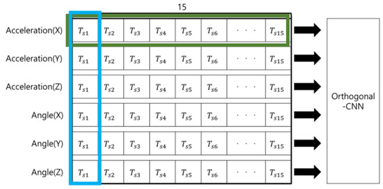 To explain the input map (input of convolution layer), its shape is shown in Figure 10, and it takes the form of a matrix composed of 6 rows and 15 columns. Each of the six rows is classified by data type; the 15 columns represent 15 sampling steps, and each column has six types of data sampled simultaneously. The input map is imported from the training data set stored in an Excel file. Of the values stored in the Excel, the acceleration ranges from −2G to +2G, and angle ranges from −180 to +180°. However, the artificial neural network needs to have a value between −1 and 1 for the input data to benefit from learning. Therefore, the acceleration from the input data was divided by 2 and the angle was divided by 180. In other words, the actual input map consists of values between −1 and 1 [24,25,26,27].
