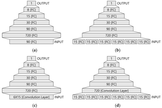 The 90 values in the box are input at the same time. Among the five ANNs that are explained in the following sections, there are the ANNs whose input layer is the convolution layer. The AI model made by these used the input form of the 6 × 15 matrix. The rest of the AI models used the input form of the 90 arrays.