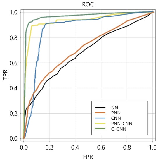 Figure 13 is a receiver operating characteristic (ROC) curve graph. An ROC curve is a graph where the x-axis is false positive rate (FPR) and the y-axis is true positive rate (TPR). TPR is also called sensitivity and it means the rate at which an AI model correctly predicts 1 for answer 1. FPR means the rate at which an AI model wrongly predicts 1 for answer 0. Figure 13 shows the average of 50 experiments as in Figure 12. In regard to the graph’s lines, the black line is for NN, the red line is for PNN, the blue line is for CNN, the yellow line is for PNN-CNN, and the green line is for O-CNN. The area under the ROC curve (AUC) is the area below the ROC curve, and it indicates the suitability of the artificial intelligence method for the target system or data. If the AUC value is 0.5, the ANN model cannot distinguish between positive and negative classes. The closer the AUC value is to 1, the better the distinction between the two classes can be made. In the comparison of AUCs of the artificial neural networks in Figure 13, the AUC values of the ANNs are calculated to be 0.576 for NN, 0.617 for PNN, 0.901 for CNN, 0.958 for PNN-CNN, and 0.984 for O-CNN. That is, O-CNN is the most suitable to make the AI model for bicycle accident judgments.