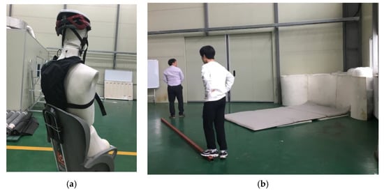 Testbed: (a) mannequin with experimental equipment; (b) obstacle and mattresses.
