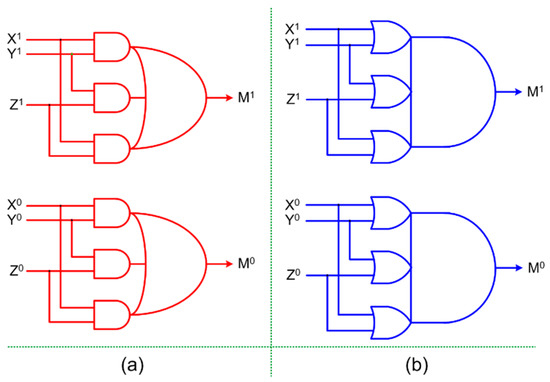 An early output asynchronous circuit [17] is able to commence the processing after receiving just a subset of the primary inputs and can produce all the primary output(s). The early output nature of the proposed majority voter shown in Figure 4a is described by an example scenario as follows. After the application of data, X1 = Y1 = 1 could result in M1 = 1 early in accordance with the Boolean majority, regardless of Z1 having assumed 1. Subsequently, in the following return-to-zero phase after the application of spacer, if X1 and Y1 assume 0, M1 could assume 0 early regardless of Z1 or Z0 having assumed 0. Thus, the early output nature may be manifested for the application of data and/or spacer in Figure 4a.