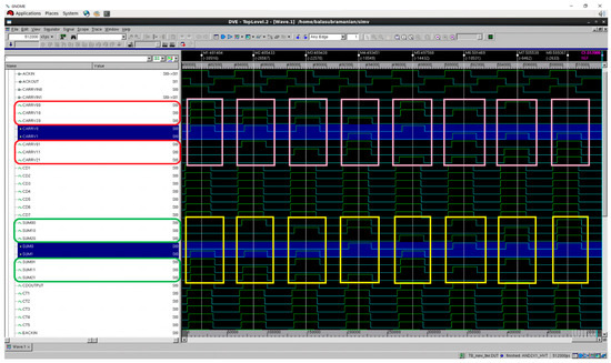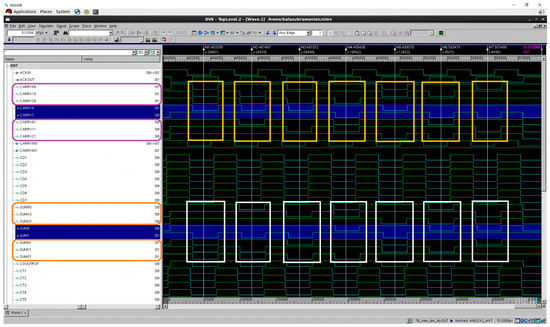 Screenshot of a portion of simulation waveforms of the TMR implementation incorporating the proposed majority voter (NEO_MV) corresponding to RTZH. Binary 1 represents data in the case of RTZH. Majority voted sum output (SUM1,SUM0) is captured within the yellow rectangles and majority voted carry output (CARRY1,CARRY0) is captured within the rose rectangles.