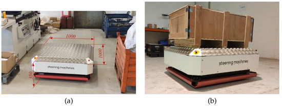 The case study deals with a test robotic platform model Moby-500 (Steering Machines S.L., Bacelona, Spain). The machine, capable of moving a payload of up to 500 , has the dimensions shown in Figure 1. The platform features safety scanners capable of building a map of its environment, and is able to navigate safely using simultaneous localization and mapping (SLAM) technology. The platform is omnidirectional, employing conventional wheels and using a maximum of three motors to achieve any movement on a two-dimensional space.