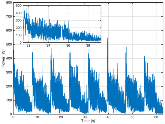 The case studied correspond to maximum velocities of with a payload of 250 . The machine is ordered to travel along the edges of the two adjacent squares, as depicted in Figure 2. The tests are carried out in an industrial warehouse, with a floor featuring some irregularities. The circuit is divided into eight phases, each one covering one of the two-meter-long edges of one of the squares. For each phase, the platform starts from a static position and ends in a new static position that in turn becomes the starting point of the following phase. Therefore, each phase contains an initial acceleration segment and a final deceleration segment. Figure 3 shows the power consumption measured every 4 . From this, it can be gathered that each test entails eight consumption spikes.