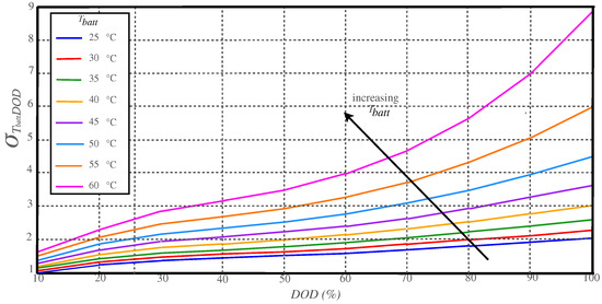 where (t) is a weight factor bigger than 1 named severity factor, and it depends on the DOD and the operating temperature. It can be calculated using the severity factor map found in Figure 4 according to [31].