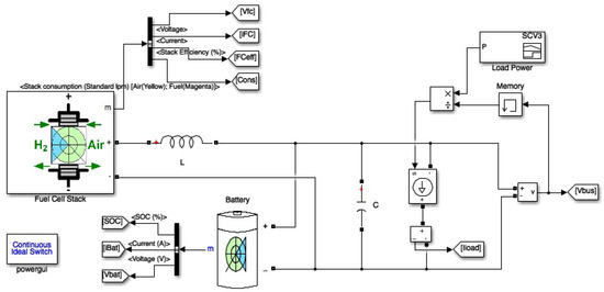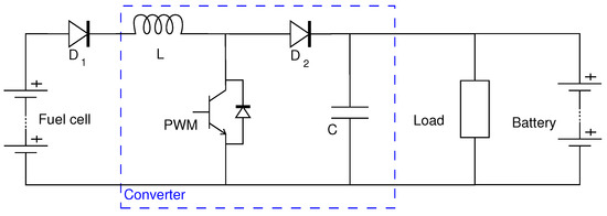 Figure 6 shows the assumed semi-active hybrid configuration, in it the battery is directly connected to the DC bus, while the FC is connected to it through a DC-DC boost converter. The DC bus voltage is fixed by the battery, as in the passive configuration. Nevertheless, this voltage is not the same voltage as the one working on the FC. The DC-DC boost converter acts as a step-up voltage converter, allowing the FC to work at lower voltage levels. The power flow in this configuration is described by the following equations: