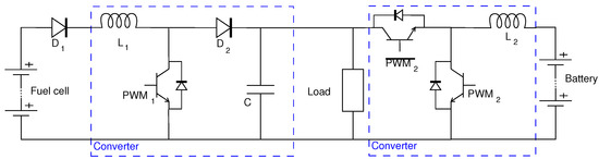 As can be seen in Figure 7, in the full-active hybrid configuration neither the battery nor the fuel cells are connected directly to the DC bus. The fuel cell, as in the case before, is connected through a unidirectional DC-DC boost converter that has the objective of stepping up the voltage of the FC to the DC bus voltage. In this case, in opposition to the semi-active architecture, the voltage of the DC bus can be controlled and does not depend on the voltage of the batteries, as a bidirectional DC-DC converter is placed between them. This converter differs from the one that connects the fuel cells to the DC bus in several aspects. Firstly, it is bidirectional in current, as it has to ensure current flowing from the battery to the load when the FC cannot cover the whole power of the load by itself, but also current from the DC bus to the battery, when the power provided by the FC is higher than the one required by the load and the batteries can recharge with the extra energy. In second place, the DC-DC converter is not of boost type, but of buck/boost, as it has either to step the voltage of the batteries up to the voltage of the DC bus when the batteries give power to the load or step the voltage of the DC bus down in the opposite case.