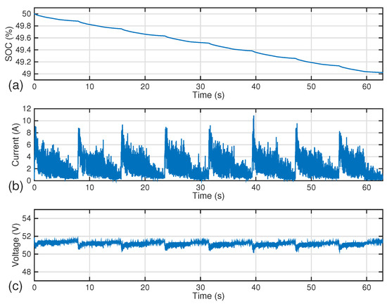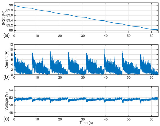 Figure 9 shows the evolution of the battery SOC, current, and voltage for the high-SOC scenario. As expected, the battery current is equal to the load current, as it is the sole power source of the vehicle. It can be seen current peaks produced by the planned motion of the robot. These current peaks generates the voltage ripple in the dc bus. The SOC, as expected, is decreasing continuously. In Figure 10, the results for medium-SOC conditions are shown. The overall behavior is similar to that of the high-SOC simulation, but noticing that the battery voltage is lower due to the inferior SOC level.