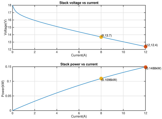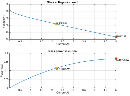 The introduction of the DC-DC converter allows the FC to work at more optimal voltage levels even if they are lower than the voltage of the batteries, as the converter will step its input voltage (FC’s voltage) up to the output voltage (DC bus voltage). Nevertheless, as the output power is smaller than the input one due to the converter efficiency, a higher output voltage leads to lower output current [47]. Equation (15) can be rewritten as: