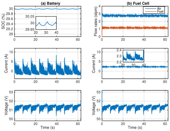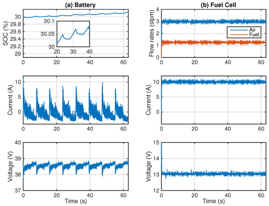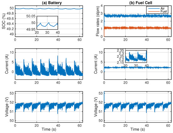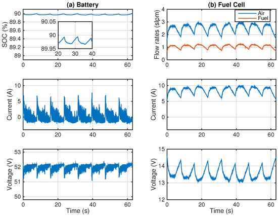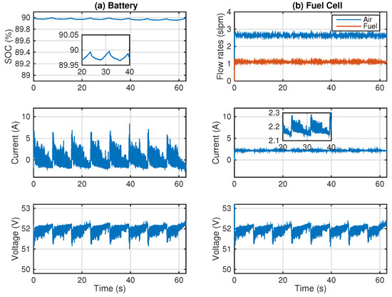High-SOC full-active hybrid simulation. (a) Battery response and (b) FC response.
