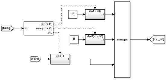 Once the operating point of the FC is set, the contribution of each power source is determined by Equations (14)–(16) [13]. As in the passive case, the fuel cell acts as the main power source and the battery complements it when needed. Like this, the FC can work with smooth profiles in order to avoid fast changing voltages that would be detrimental as it would cause starvation. FC and Battery will work together when the required power is higher than that of the FC and the FC will be used to provide power to the load and battery otherwise.
