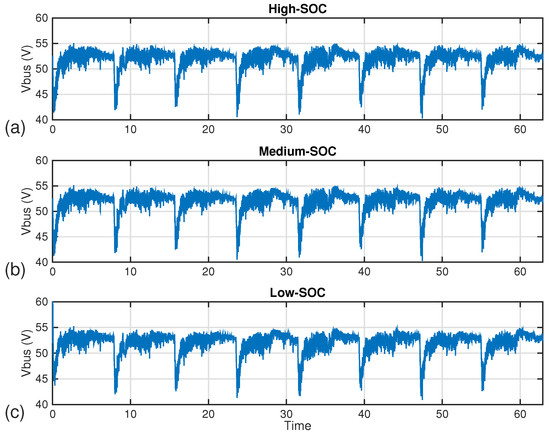 Evolution of the voltage of the DC bus in (a) high, (b) medium, and (c) low SOC full-active hybrid simulation.