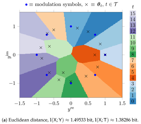 The phenotypes in this scenario hold real valued parameters that represent the real and the imaginary parts of 16 complex numbers. The optimized parameters are denoted using × markers in Figure 7 in the complex plane. As it can be seen, the genetic algorithm automatically learns favorable positions in terms of the maximum preservation of I under the respective distance . The quantizers from Figure 7a,b both can be described with parameters, but have quantization regions with very complicated shapes that allow us to preserve large amounts of relevant information. The preserved relevant mutual information is I bit (i.e., of I) for the Euclidean distance and I bit (i.e., of I) for the Manhattan distance.