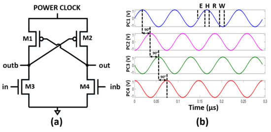 Efficient charge recovery logic (ECRL) is adopted in this work for the adiabatic operation due to its robust operation [22,33]. The transistor-level implementation of an ECRL buffer is shown in Figure 1a. ECRL utilizes four power supply signals, each with a 90 phase shift as shown in Figure 1b. Specifically, there is a 90 phase difference in the power supply signal of adjacent logic gates. There are four stages of operation, depending upon the power supply signal:
