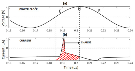 where T is the time period of the power-clock signal and 1 < = n < = N for N number of samples obtained. The lower and upper integration limits of the integral are determined based on the start and end times of the e v a l u a t e phase, which are known by the attacker via the power-clock signal. Using this approach, the overall number of required samples to be collected is reduced to only 704 (since one charge sample is measured in each clock cycle and the total number of cycles for encryption is 704). In conventional practice, 140.8 K samples would be collected, assuming that an attacker measures approximately 200 current samples in each cycle [19]. Thus, the proposed approach reduces the sample size by two orders of magnitude. Note that this approach is not feasible in conventional static CMOS based operation since the current is drawn from the supply voltage based on the timing characteristics of the internal target signal, which is typically not accessible to the attacker.