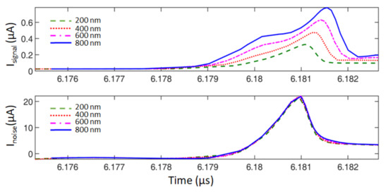 Figure 8. Signal and noise currents drawn from the power supply for different gate widths of the target signal load in adiabatic SIMON core.