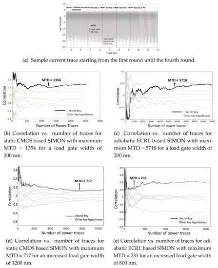 The resistance of an encryption cipher against CPA attack is determined by measurements-to-disclosure (MTD) [35]. MTD is the number of current traces measured at the crossover point between the correlation coefficient of the correct key and the maximum correlation coefficient of all of the incorrect key hypotheses. Higher MTD implies a greater resistance to the attack.