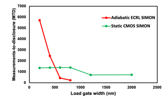 Finally, the effect of parasitic capacitance at the target signal node on CPA is quantified. The correlation vs. number of traces for static CMOS based SIMON and adiabatic SIMON for an increased target signal load size is depicted, respectively, in Figure 9d,e. These plots show that for a load gate width of 1200 nm, the MTD of a static CMOS based SIMON is 717, whereas for an adiabatic SIMON, the MTD is only 233 for a load gate width of 800 nm. The dependence of MTD on the size of the load gate is shown in Figure 10 for both static CMOS and adiabatic implementations. According to these results, for static CMOS implementation, if the size of the load transistor is increased by 6× (thereby increasing the capacitance seen by the target signal), MTD is reduced by a factor of 2. Alternatively, for adiabatic implementation, the same reduction in MTD is observed when the size of the load transistor is increased by only 2×. Thus, the CPA attack on adiabatic SIMON is more sensitive to the changes in the capacitance seen by the target signal.
