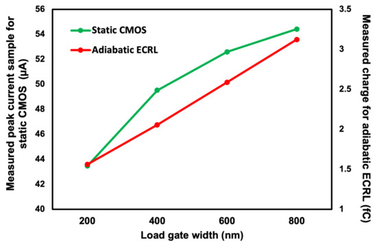The primary reason for this difference is related to the method of analysis of the current traces. Since the integral of current is used for adiabatic SIMON CPA attack, as explained in Section 4.2.3, the effect of increased load amplifies the charge at a higher rate than the peak current samples used in static CMOS based SIMON. This behavior is depicted in Figure 11 where the dependence of charge and current on the size of load is shown. When the width of the load gate is increased by 4×, the charge consumed by the adiabatic ECRL is doubled whereas the peak current consumed by the static CMOS logic increases by approximately 1.2×. Thus, the correlation is higher for ECRL based SIMON for the same increase in load size, thereby reducing the MTD more.