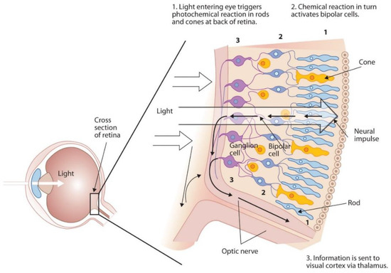 - Kolb, H. Cone Pathways through the Retina. 2011. Available online: https://webvision.med.utah.edu/book/part-iii-retinal-circuits/cone-pathways-through-the-retina/#:~:text=Cone%20photoreceptors%20are%20the%20sensors,of%20light%20in%20the%20retina.&text=The%20circuitry%20whereby%20cone%20signals,at%20the%20outer%20plexiform%20layer (accessed on 3 June 2021).