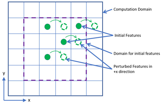 A schematic of the perturbation technique is illustrated in Figure 4. Solid green locations are where the features are present in the image to activate the photosensors. The image is then perturbed in +1 position in the x-direction as shown. From this, the brain obtains the information that the dotted line locations are the right neighbors of the feature containing photoreceptors. However, it cannot determine who is the neighbor of whom just from one exercise like this. To determine the neighbors, the process is repeated with different images, that is, the solid green locations are varied but with the same density for the simulations. The number of images used is identified as iterations in this work. In this illustration, 25% (i.e., 4 out of 16 locations) of the domain allotted for initial features are populated and is controlled by a rounding adder (RA) in the computation. For the given configuration, RA is equal to 0.25.