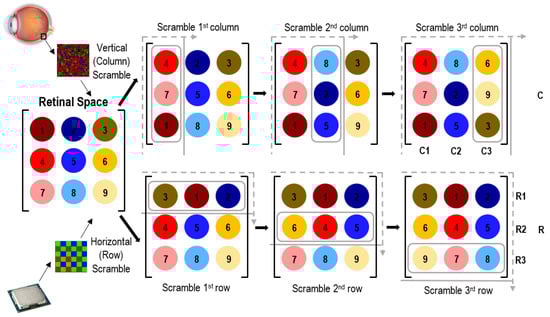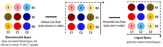The objective of this section is to logically simulate the spatial mapping of photoreceptors in the brain. The sensor (photoreceptor) locations in the retina are designated in the retinal space matrix, as depicted in Figure 5. The task is to reconstruct this retinal spatial distribution in the brain’s neural network, which is referenced as the logical space. In a digital camera, the pixels are numbered in the chip, and so the software does not require this spatial calibration. Contrarily, in the biological vision system, the retinal space is not structured, and the logical space of the brain is not systematically numbered. It is hypothesized that the brain identifies common features such as an edge or colored area and then trains itself to reconstruct the tentative locations of the retinal space for image perception. We suppose that 9 sensors are laid out in a 3 × 3 matrix in the retina as depicted in the retinal space in Figure 5. Next, we assume horizontal and vertical edges are detected by the retina. We then suppose a vertical line of light activates the first column, which contains sensors 1, 4, and 7. The brain becomes aware that sensors 1, 4, and 7 are activated, but it will not know their correct order. The brain needs to determine this order to reconstruct the image. Here, we let the signals be arbitrarily scrambled into the order 4, 7, 1, which are activated in the presence of that edge. Similarly, the next two columns are activated by other edges and are scrambled as 8, 2, 5 and 6, 9, 3. In Python, this data structure is called a set; compared to an array, a corresponding set contains the same numbers, but unlike the array, it does not record any particular order for the numbers. In applying the same process along the horizontal direction, the horizontal edges will create scrambled rows [(3,1,2); (6,4,5); (9,7,8)], as illustrated in Figure 5.