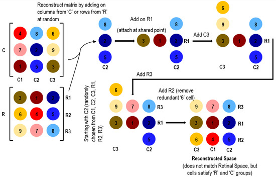 Let us suppose that the static image information provided the brain the information that (8,2,5) are in the same column, and (3,1,2) are in the same row. Now, if we match this row and column at their shared point (2) and continue similarly adding on more rows and columns as illustrated in Figure 6 until the matrix is fully populated, the resulting reconstructed space satisfies the row and column sets (i.e., each row and column contains valid neighboring cells), but the whole set does not match the retinal space distribution (i.e., the cells are not in the correct order). This illustration demonstrates that the spatial mapping of sensors to the logical space using static images is not dependable; it may result in solutions that match the row and column sets but not the full matrix configuration.