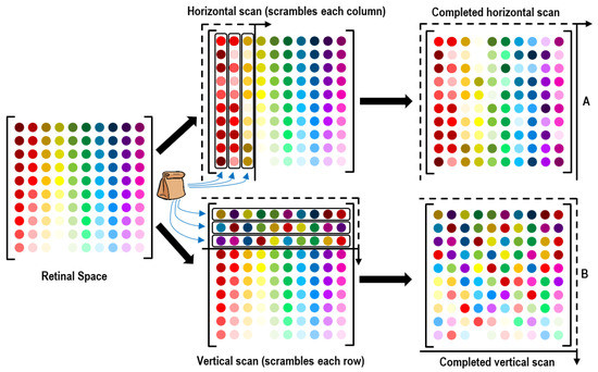 In the previous sections, it was demonstrated that a static image cannot help with identifying the sensor at a specific location; for proper sensor location identification, image or eye motion is required. The scanning of an image or view is now applied on a larger set of sensors. Figure 8 depicts the retinal space, in which each photosensor is marked with a unique color as an identifier. A horizontal scan of vertical edge lines creates scrambled datasets as shown at the top of Figure 8. The bag represents the “scrambling” of a row or column to obtain an unordered set of numbers; the rows and columns indicated by the bag contain all of their correct (same as retinal space) respective sensors, but they contain no information about the sequence or location of the sensors within the row/column. The vertical scan of horizontal edges is depicted in the lower portion of Figure 8. To better understand these scans, we can imagine a situation where the eye sees an edge, such as a corner or wall-ceiling intersection. With eye motion, that line is moved across the retinal space, allowing the brain to logically reconstruct the image as it enters the eye (before becoming scrambled along the neural pathways to the brain); this is the process by which these datasets are created. This may not truly be how the brain processes images, but it is a possible logical method that can be used for locating sensors in an array. The biological visual learning process is described in the next section.